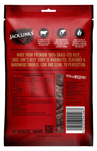Smoky, rich and unmistakably beefy. This classic jerky is slow-marinated, seasoned, and hardwood smoked to bring out bold, savoury character in every bite. The kind of flavour your ancestors would’ve built a fire for. No nonsense - just real meat, made the traditional Jack Link’s way.